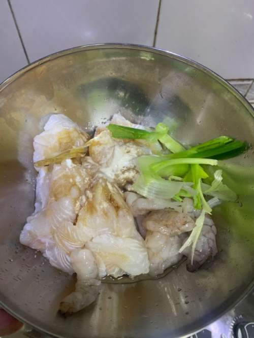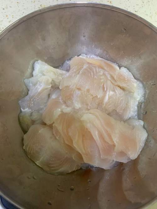 3调味,放入盐、白糖、胡椒粉、生抽、料酒、姜片、香葱、蛋清、淀粉。