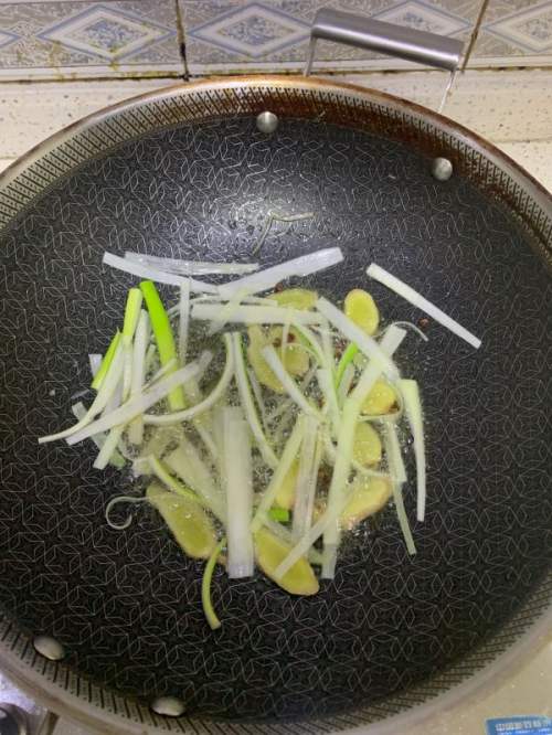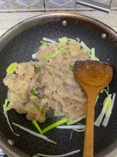 9鱼片放进去翻炒。快熟的时候香葱放进去。