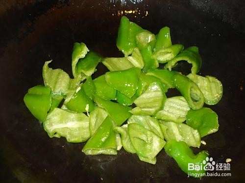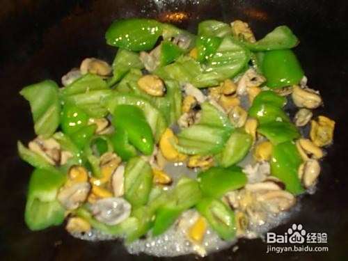 锅内放入少许油,放入葱花炒香,放入海虹肉和青椒片翻炒2分钟。