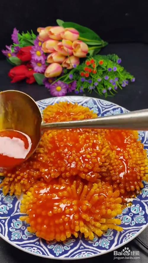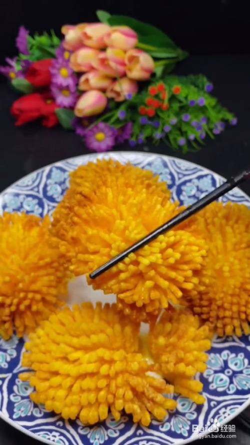 盘中放驾粒入20g玉米淀粉,搅拌均匀,把土豆裹上一层淀粉,六成油温下锅炸,炸出菊花形状,摆入盘中