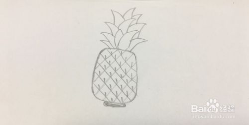 在菠萝的底部画一个小长方形;在椭圆形的外面顶部的中间画上数个月牙形作为“菠萝把”(菠萝的叶子)。