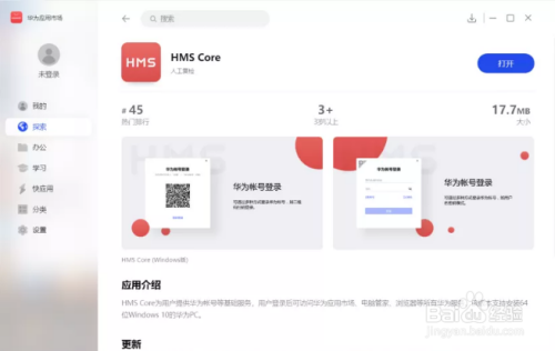 下载并安装华为 APP Gallery。初次启动华为应用市场,默认会进行版本更新。更新完成后,在市场中搜索并安装 HMS Core。