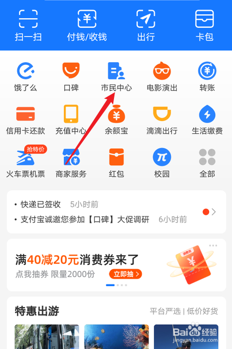 首先打开支付宝,点击市民中心。