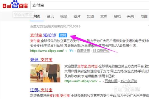 打开百度,搜索“支付宝”,并点击打开支付宝官网。
