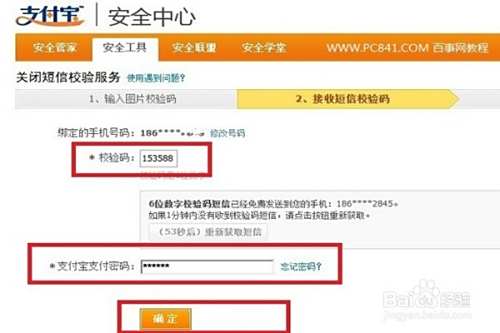 输入手机接收到的验证码和支付宝支付密码,并点击下方的“确定”。