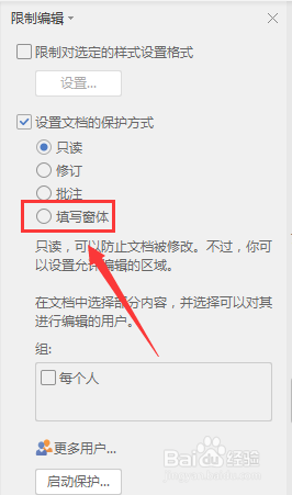 在『设置文档的保护方式』中选择『填写窗体』