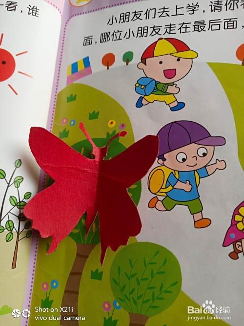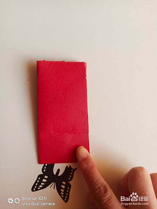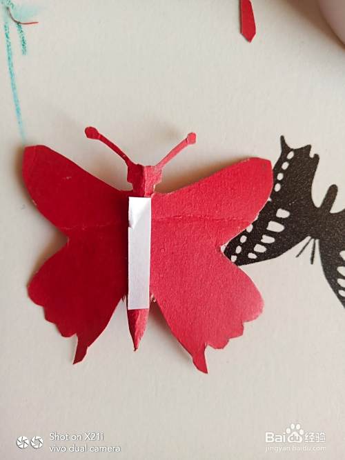 把纸张摊开,一只蝴蝶就完成了,我们用双面胶剪一小段贴到蝴蝶身子底部,如下图所示。