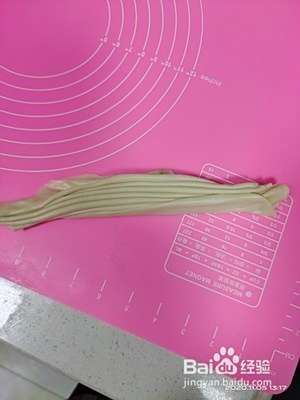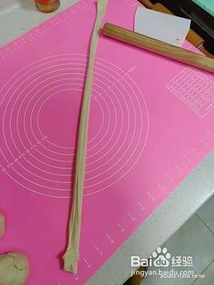 抓住两头,把面慢慢拉长,要慢一点拉,一点一点拉长