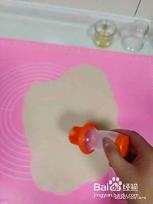 把面揉成长条,先切10个面挤子,每个大概10克,忘了拍图片了,然后把面擀大,越大越薄越好,两面刷植物油,