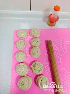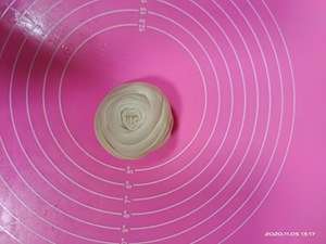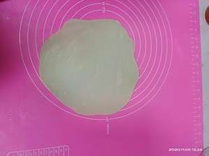 取第一个小面团,因为十个都做完,第一个又醒了10多分钟,二次醒发的面团更好 擀成圆形,如图