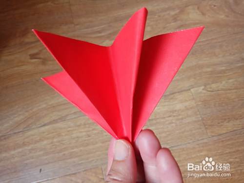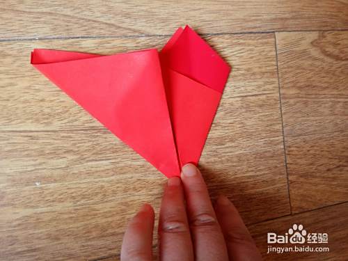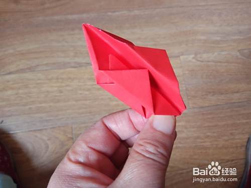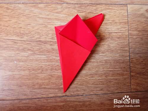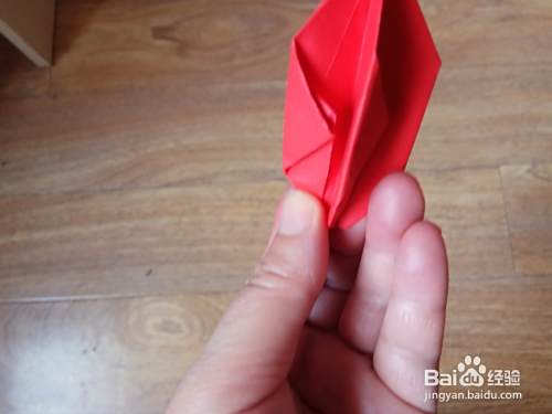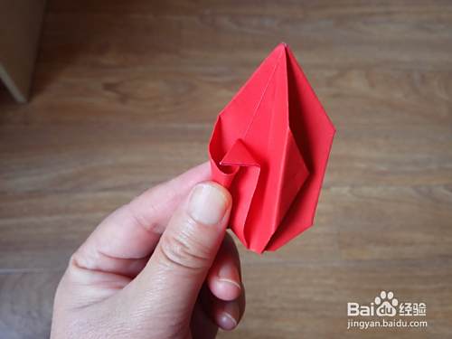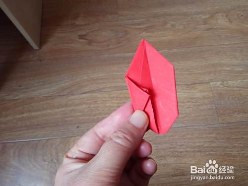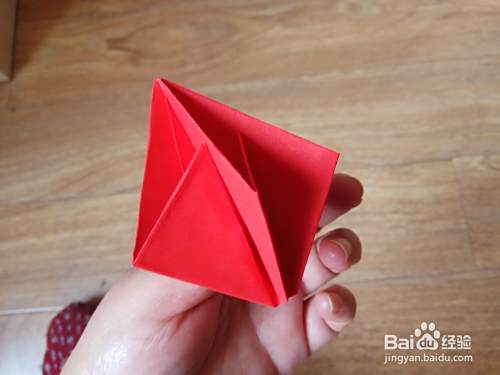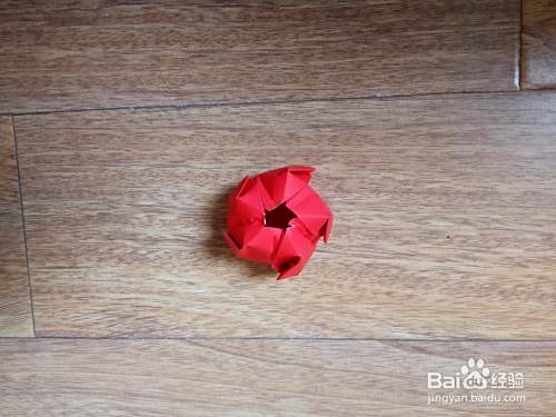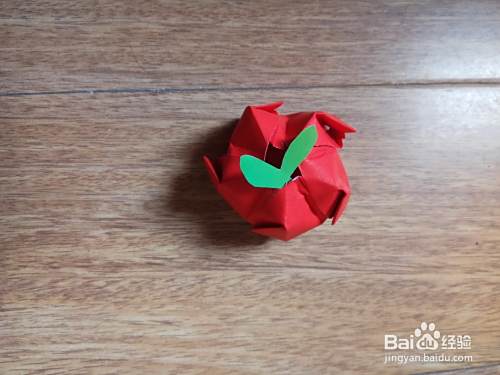 将五个角都折好后,用手拿着没有口的中心位置,将有口的位置用嘴吹起成下图形状。红苹果就折好了。