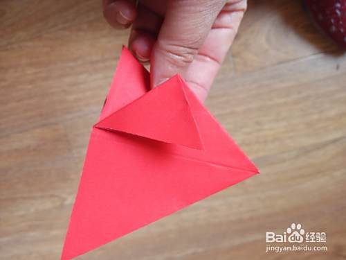 然后,将每一个折起后的下面一小角向下翻,并将小角插在下面的三角中间,如下图1,最后按压一下成下图2。一次类推,五个角一样的折法。