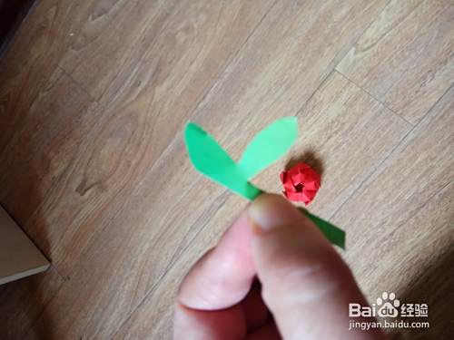 然后,再用绿色的纸,剪成苹果叶子的形状,下边带一树枝,将其插放在红苹果的开口处,红苹果就做好了。