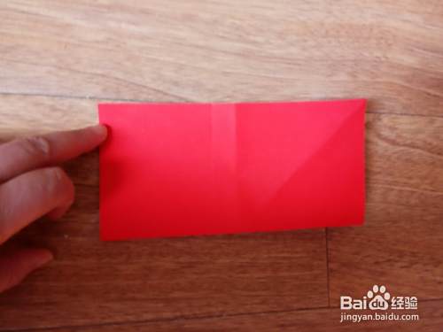 将红纸对角折一下,将多余部分去掉,展开后成正四边型,然后对边折起来成长方形。如图。