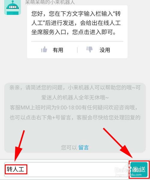 5、底部输入框填写“转人工”,然后再点击“发送”按钮。