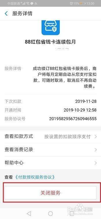 点击关闭服务,就成功关闭了淘宝红包省钱卡自动续费