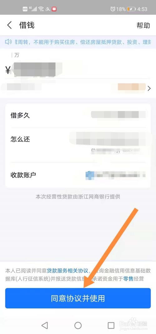 输入金额、日期,选择收款账户等信息,仔细阅读《贷款服务相关协议》,确认无误后,点击”同意协议并使用“即可