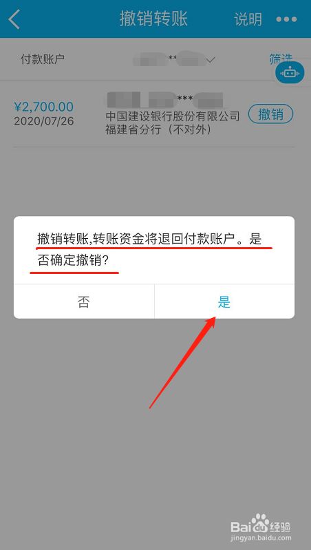 打开后,点击是,确认撤销转账,转账资金将退回付款账户(前提是该笔转账为2小时后到账或24小时后到账,所以设置转账到账时间很重要),如下图所示: