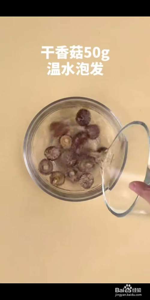 1.准备干香菇50克,温水泡发,香菇水留用;