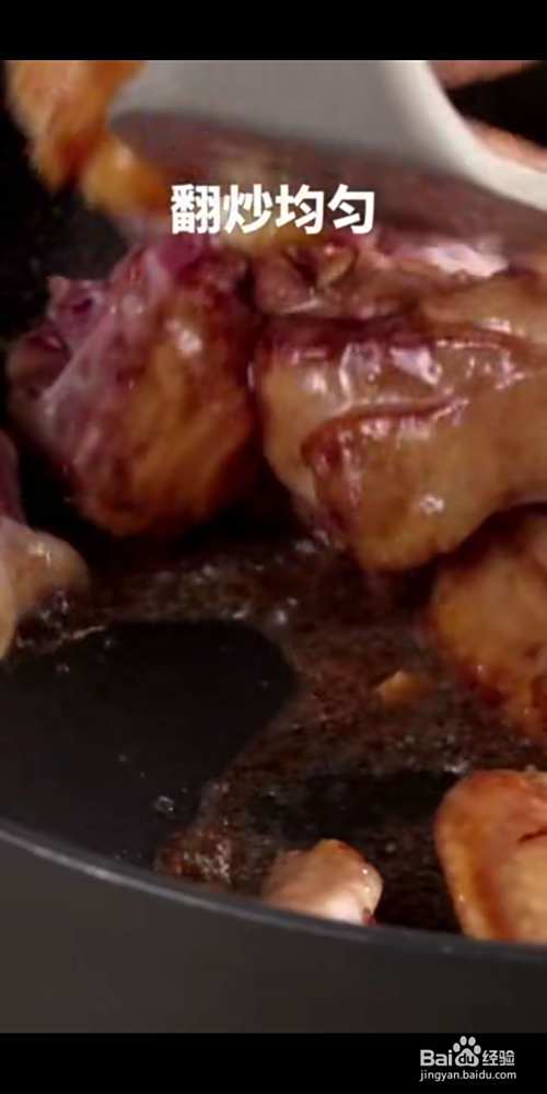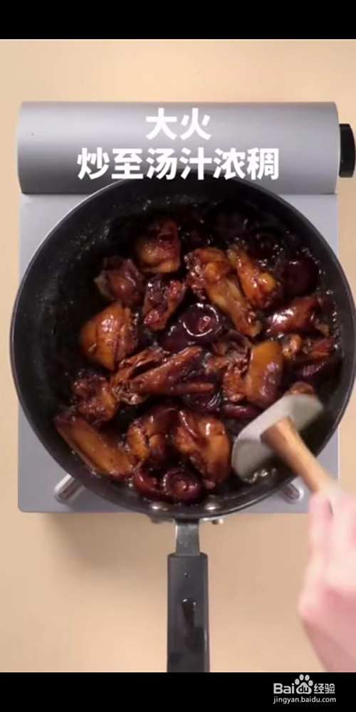 2.锅内放油,加冰糖30克,小火炒至变色,加三黄鸡半只,翻炒均匀;