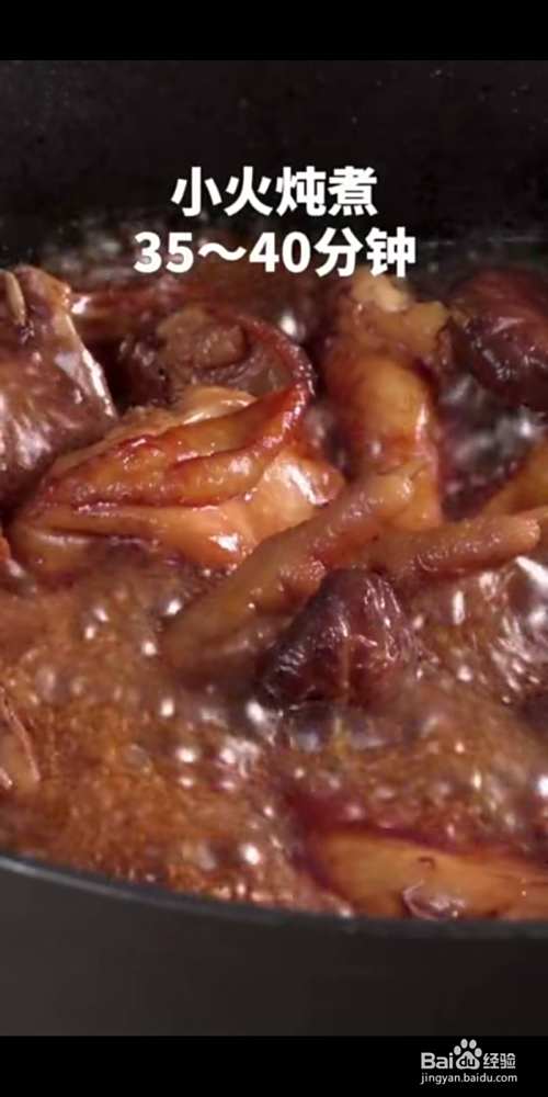 倒入泡好的香菇,加香菇水没过鸡块,加盐5克,生抽5克,小火炖35到40分钟。