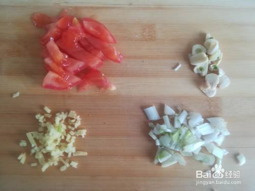 把猪五花肉切成片,圆白菜切成丝,西红柿切成块,葱切葱花,姜切末,蒜切成片,粉条备好。