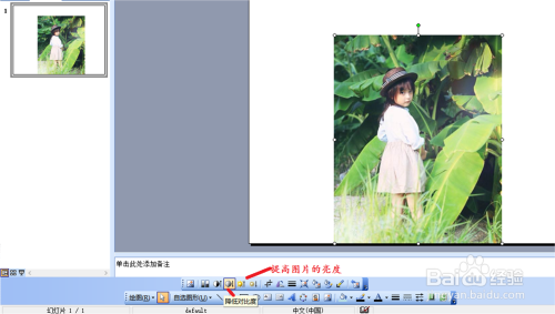 当图片工具栏出现时,降低图片的对比度,提高图片的亮度,尝试着调整图片的透明度。