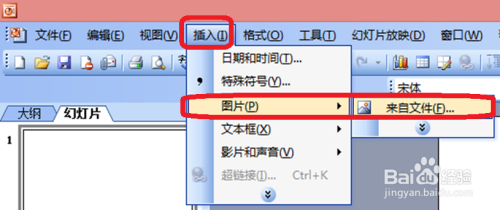 打开ppt,点击上方工具栏中的插入,在下拉框里选择“图片——来自文件”。