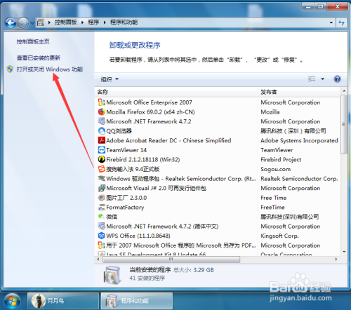 进入程序和功能界面后,点击“打开或关闭Windows功能”,如图。