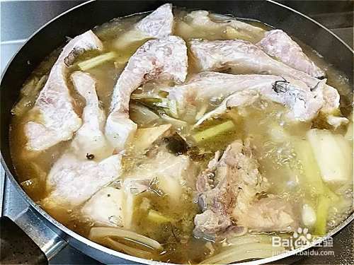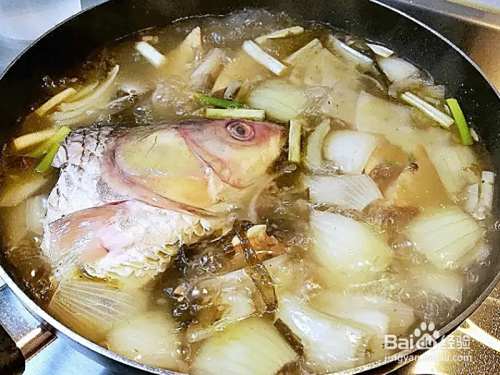 锅里放一匙油用中小火炒香主料包,等香味出来再加水放葱白、洋葱、三角豆腐煮到滚,放入鱼头先煮2分钟。