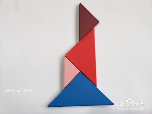 拿出一个咖啡色中三角形放在红色大三角形的上面,如下图所示。