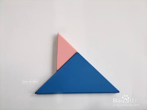 拿出一个深蓝色大三角形和一个粉色小三角形,把它拼成下图的样子。