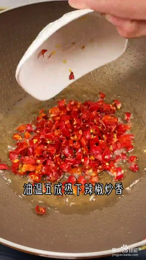 然后锅中放油,油热后下入干辣椒段,炒出辣香味