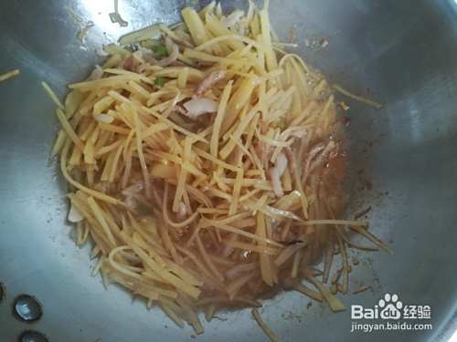 再把西红柿入锅与土豆丝翻炒均匀完工。