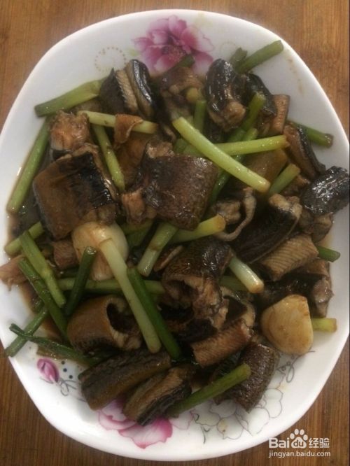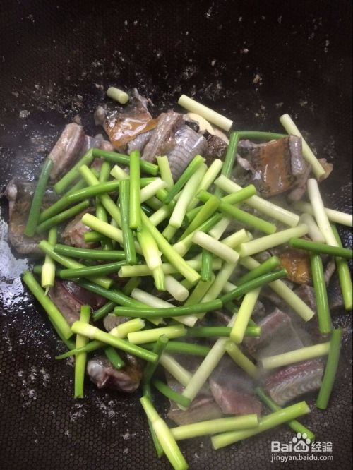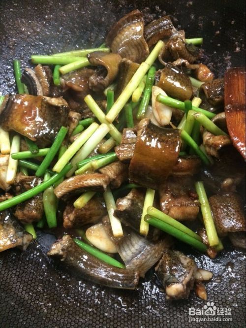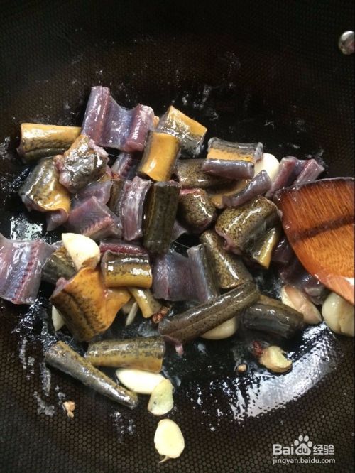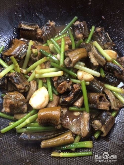 然后下入鳝鱼翻炒,炒变颜色后下蒜苗翻炒。