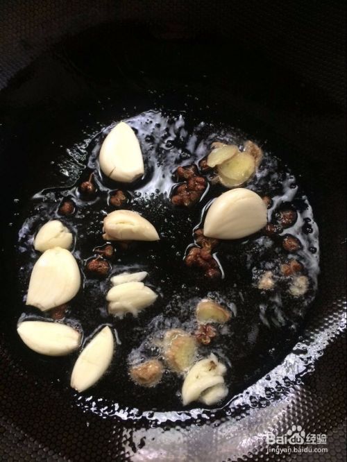 把炒锅放油烧热,下大蒜瓣,花椒,姜片炒香,吃辣的再放点干辣椒,我们家有老人孩子吃就没放辣。