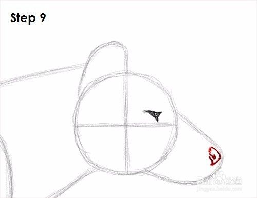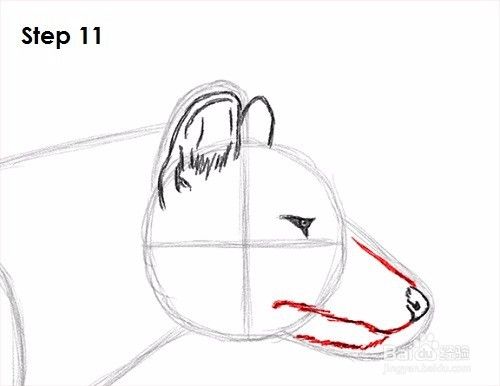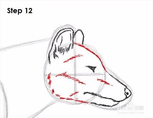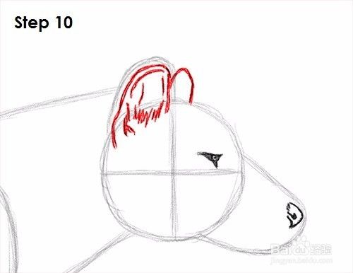第10步:使头部的弧线变暗,但使线条更加曲线,以形成塔斯马尼亚虎耳朵的形状。在耳朵的内部结构和毛皮上添加几条线。在另一侧的耳朵右侧绘制一个较小的弧形。