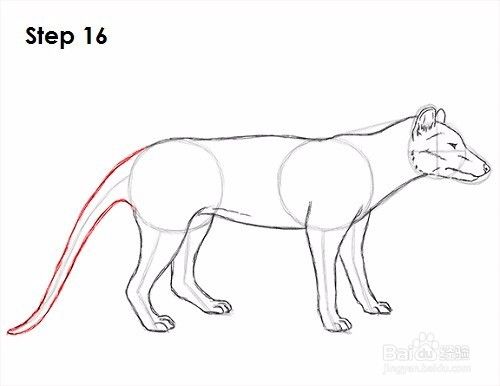 第十六步:用左边的线作为引导,画出塔斯马尼亚虎的尾巴。遵循指南的基本路径,但在变暗线条时使尾部基部变粗。