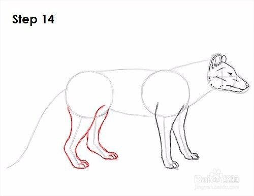 第14步:现在使用左侧的线作为导游,画出塔斯马尼亚虎的后腿。记得按照指南的基本路线,轻轻勾画腿部的形状。在脚趾的底部使用几条小曲线。用右侧的线作为指导,以相同的方式在另一侧绘制后腿。后腿应该在顶部稍厚一些,弯曲得比前腿多。