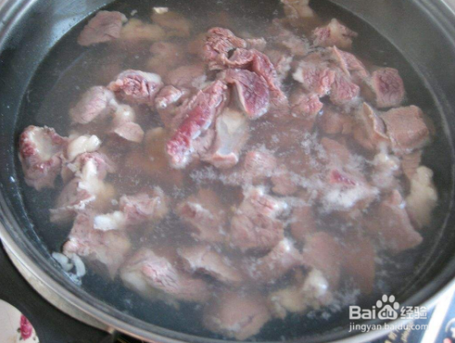将牛肉放入锅中,加入凉水,进行焯制,如图所示。