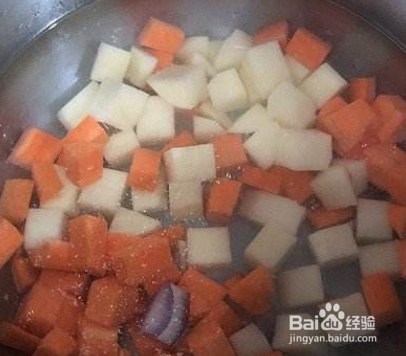 将土豆洋葱和胡萝卜切成小块,放在一边备用,如图所示。