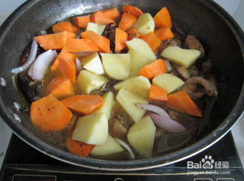 起锅烧油,将土豆、胡萝卜、洋葱加入锅里面炒香,如图所示。