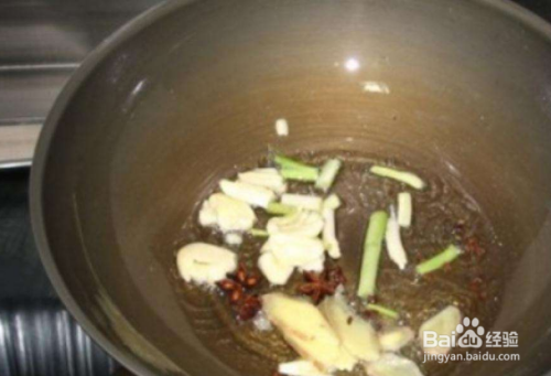 起锅烧油,加入八角、葱姜蒜将其炒香,如图所示。