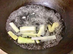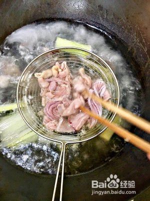 姜、葱段放入锅中加水烧开放料酒,烧开后下鹅肠以外的其他东西,煮5分钟左右