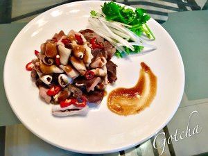 鹅杂摆盘,撒上辣椒粒,放上香菜段葱白,所有酱料调匀后试味合适后挤柠檬汁搅拌均匀淋于鹅杂之上。完成。吃的时候拌匀。