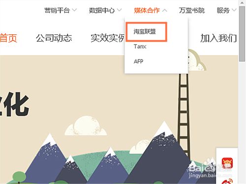 页面跳转后点击媒体合作下拉按钮中的淘宝联盟,如图