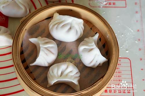 8.水晶虾饺是半月形,蝴蝶肚共有十二褶,这是粤式经典的水晶虾饺做法。做好的饺子,放入竹编蒸笼。