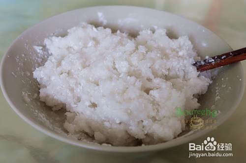 4.水晶皮的制作:100克小麦淀粉倒入一个大盘子里,把150ml沸水倒入,并拌均成半透明状态,接着把另外的100克小麦淀粉加入揉搓光滑面团