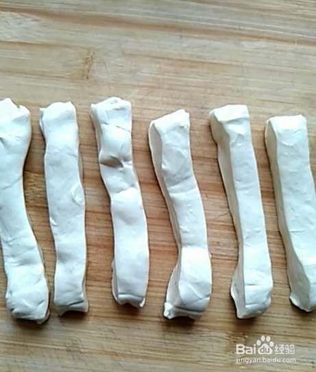 把面团放入盆中,醒2个小时,再把面团切成长条,两个叠在一起,中间用筷子压一下;