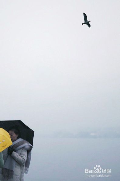 下雪天让场景色彩极具美感,道路两边的枯树和护栏让画面多了一些空间透视感,突然闯入镜头的撑伞人成了焦点。